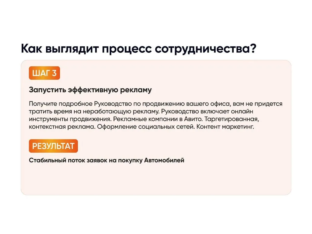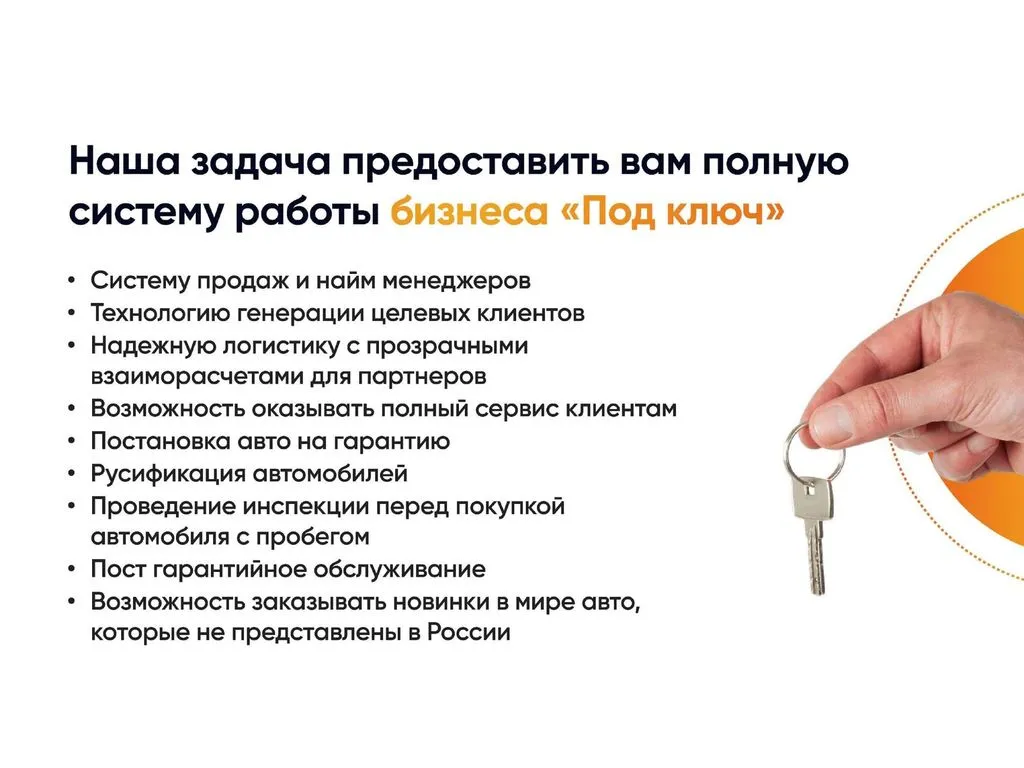 Сегодня мы ищем партнёров для расширения через франшизу. Теперь предприниматели из разных регионов могут воспользоваться нашим опытом, открыв представительство компании или став агентом и зарабатывая от 400 000 до 2 000 000 рублей с продажи одного автомобиля. 💰