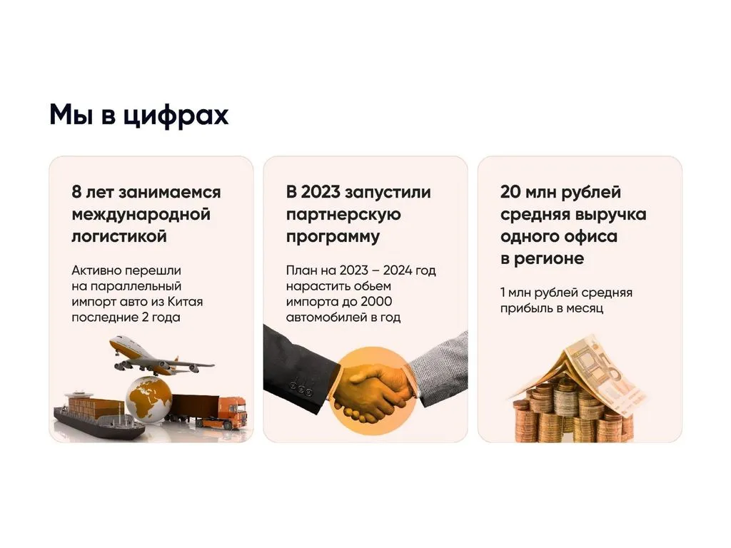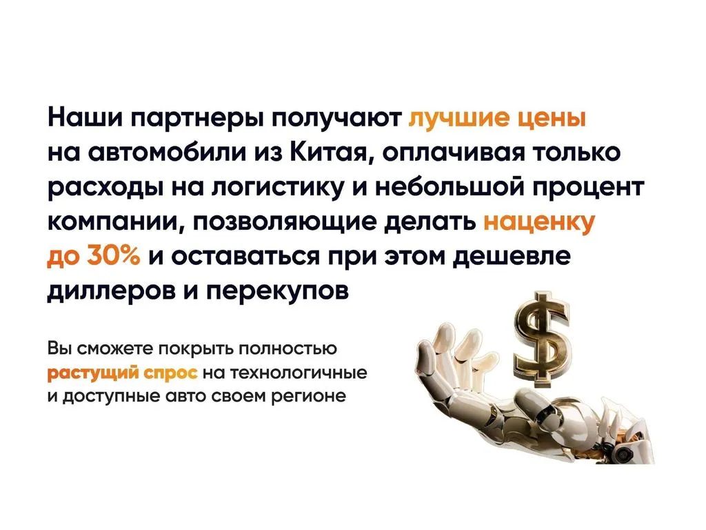 - Быстрый старт и окупаемость: Запуск представительства занимает всего 20 дней, а окупить вложения можно уже с первых двух проданных автомобилей.