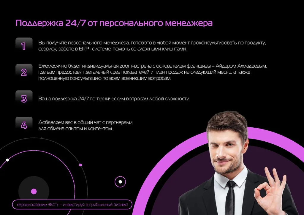 Оставьте заявку, и с вами свяжется наш представитель для дальнейших шагов. Далее пройдёт формат переговоров через ZOOM, а затем мы поможем вам с запуском вашего бизнеса. 🚀
