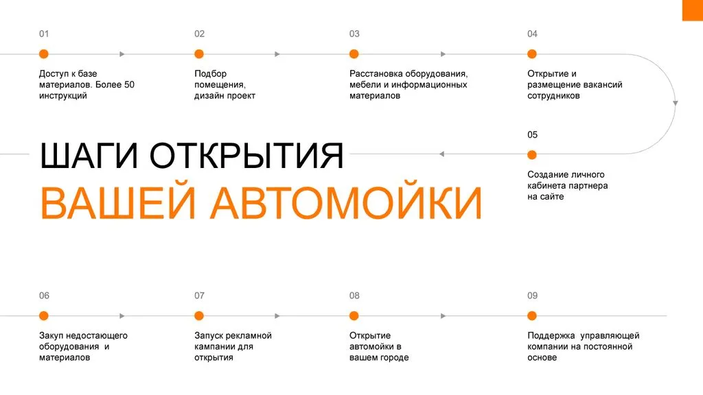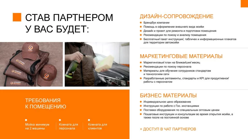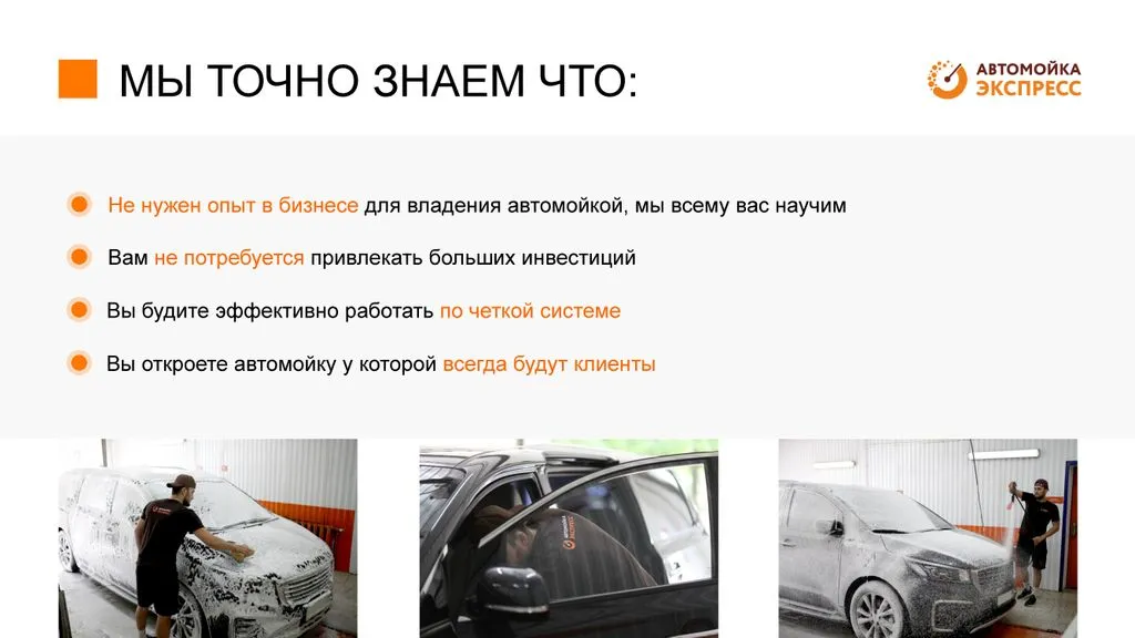 Наша задача - помочь партнёру без проблем запустить бизнес и стать частью сети «Автомойка Экспресс». Мы сопровождаем на всех этапах: от оформления юридического лица до увеличения потока клиентов и развития бизнеса. На каждом этапе мы обучаем, помогаем и предоставляем необходимые инструменты. 🤝