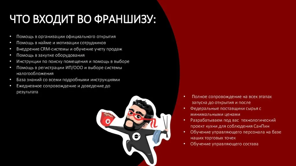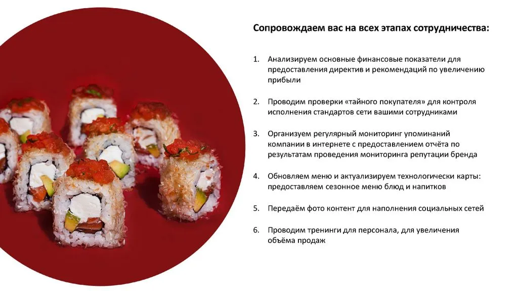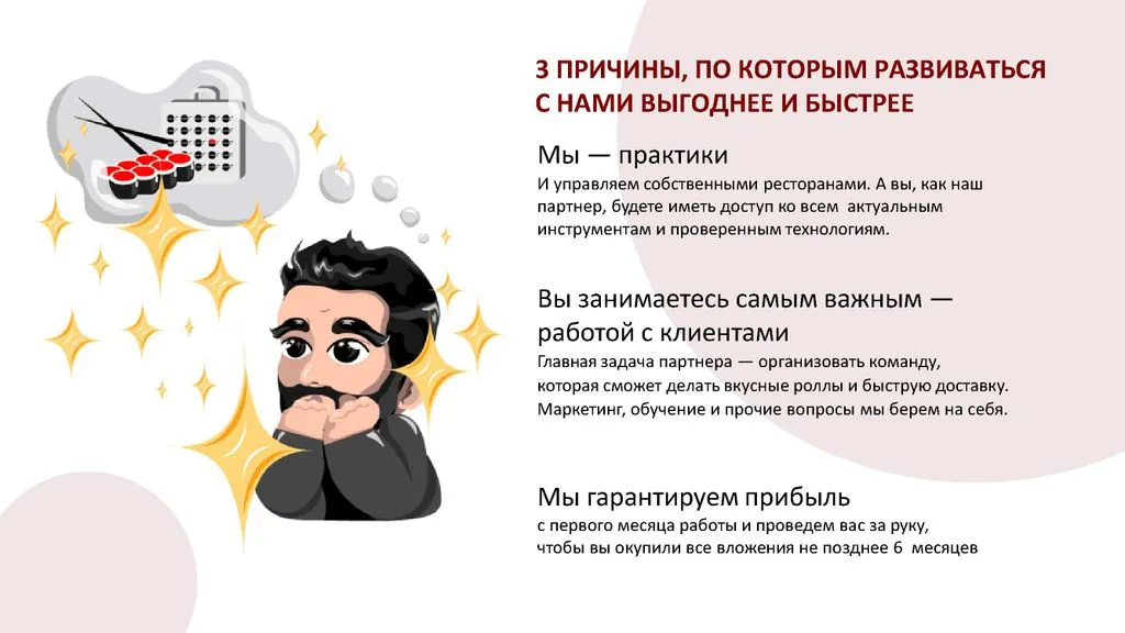 Мы не просто знаем теорию, мы управляем своими ресторанами и делимся опытом. Ваша главная задача – собрать команду, которая сможет готовить вкусные роллы и обеспечивать быструю доставку. 🍣 Все вопросы маркетинга, обучения и поддержки мы берём на себя, чтобы вы окупили все вложения уже через 6 месяцев. 🔄