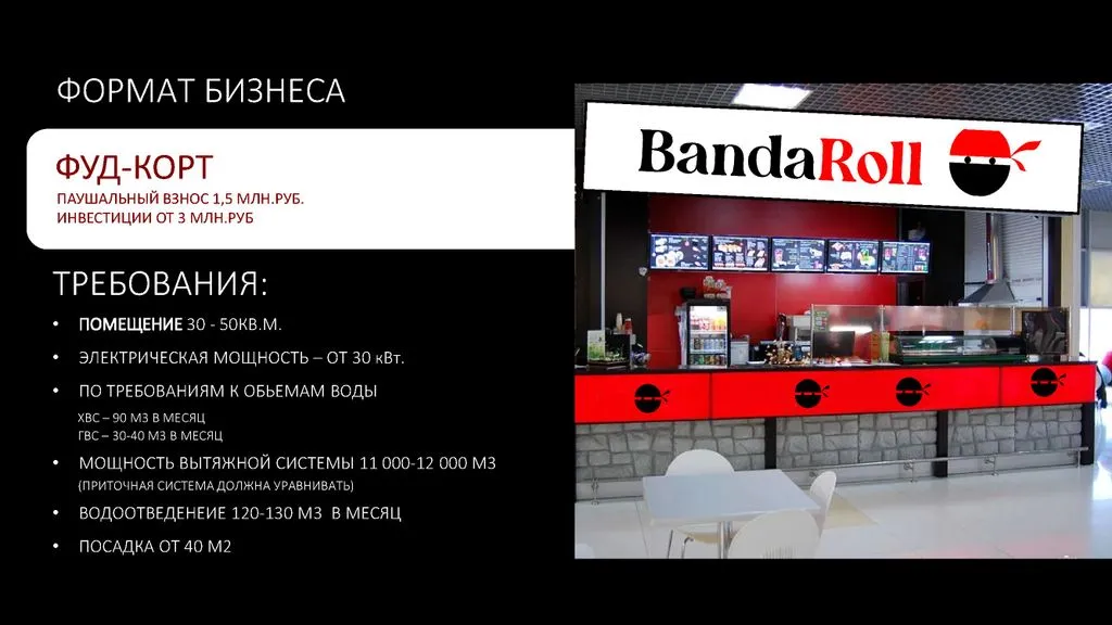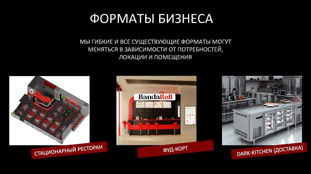 Banda Roll – это гибкая франшиза. Вы можете открыть стационарный ресторан, точку в ТЦ или dark kitchen, работая исключительно на доставку. 🍱
