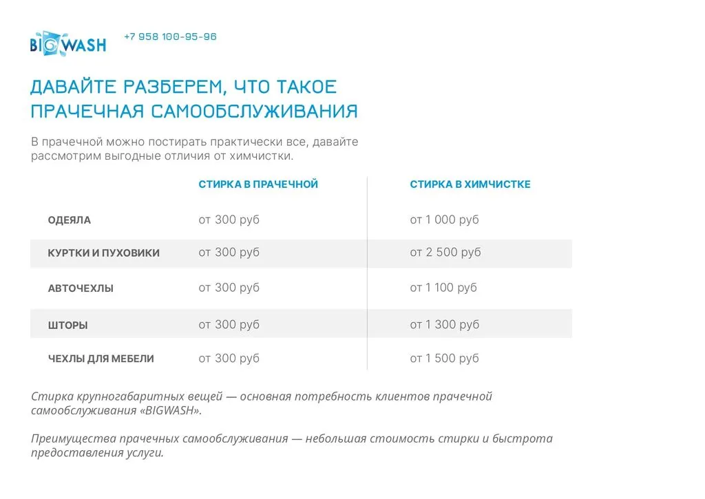 - Качественнее. Наше оборудование обеспечивает лучшее качество стирки по сравнению с домашней и химчисткой 🧼.