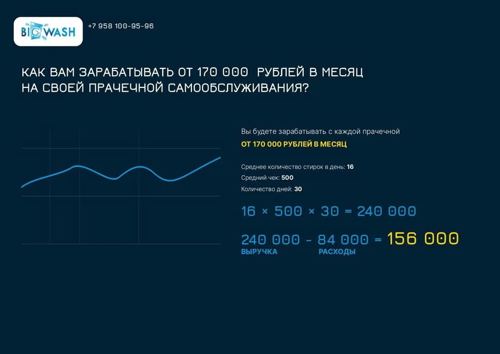 Чистая прибыль в месяц: 158 000 рублей. Для выхода в прибыль достаточно всего 4 стирок в день 🧼.