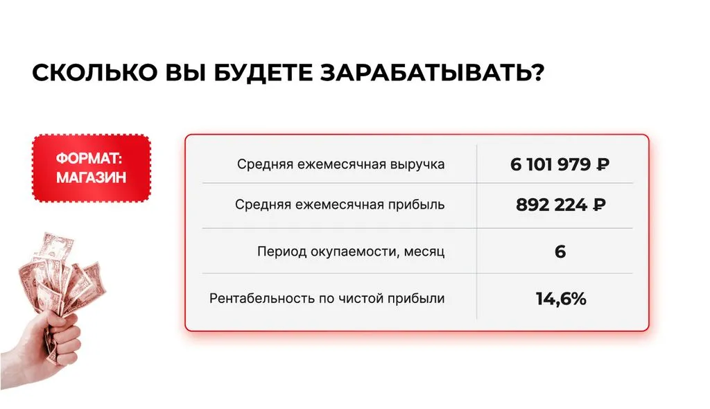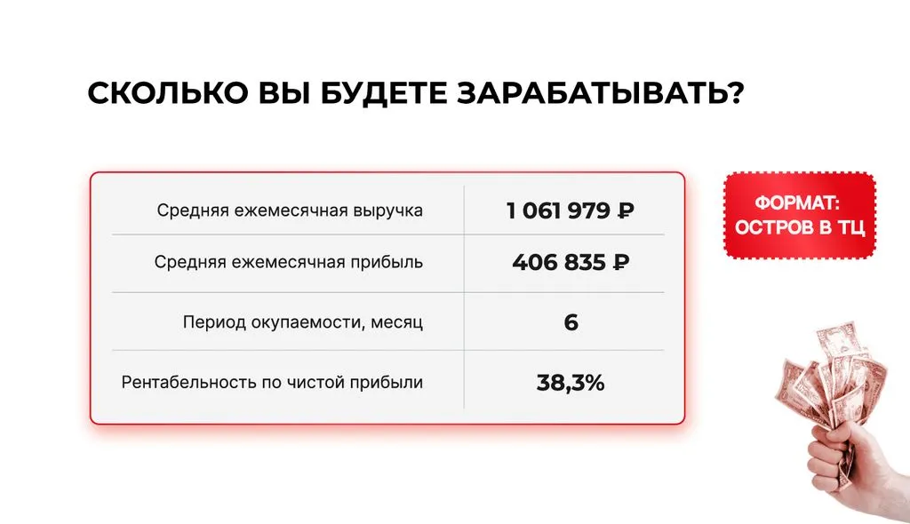 - Рентабельность — 38,2%, одна точка приносит от 400 000 рублей чистой прибыли 📊