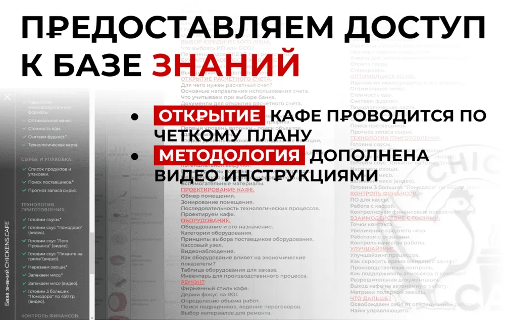Вам будет открыт доступ к базе знаний и обучение с личным участием основателя сети, чтобы вы могли открыть прибыльное кафе и масштабировать свой бизнес 🧑🏫.
