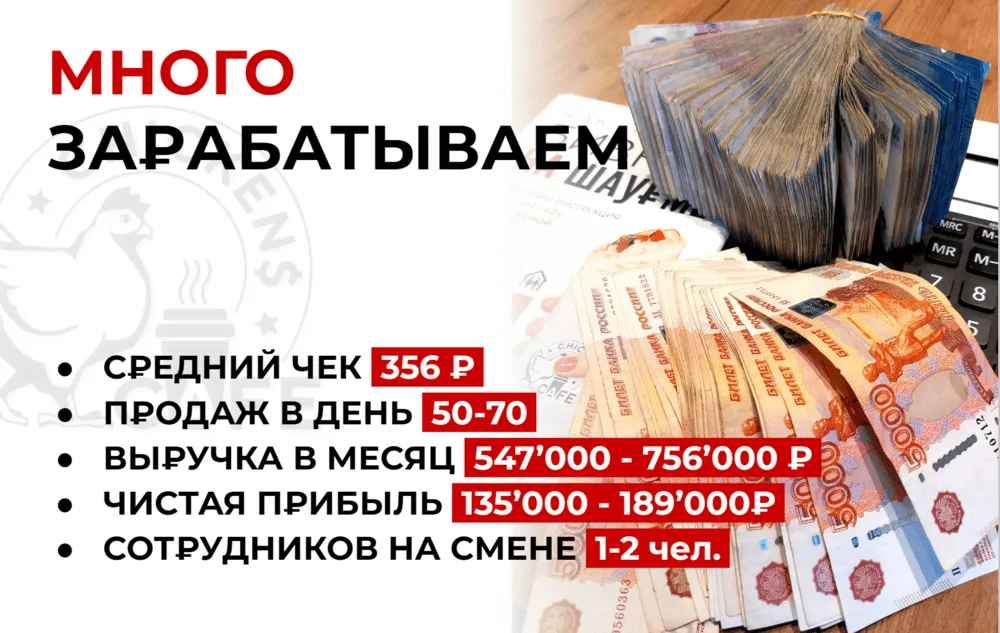 Партнёры получают доступ к секретной базе знаний, проект кафе, перечень оборудования, сырья для шаурмы, а также CRM-систему с техкартами и помощь при открытии 💡. Финансовый результат: чистая прибыль от 156 000 рублей с каждого кафе уже через 7 месяцев 🤑.