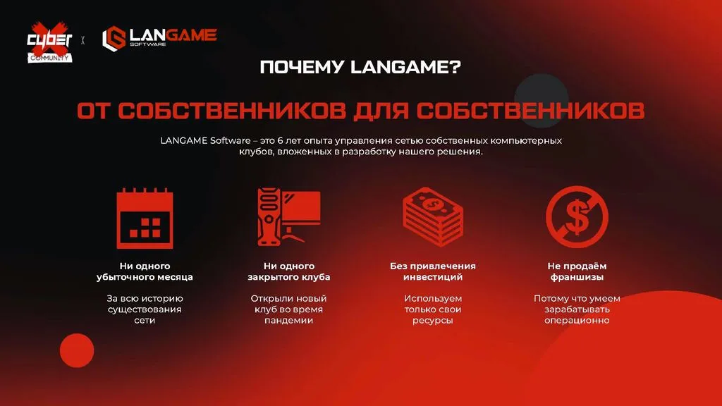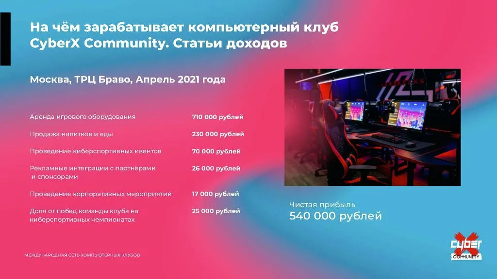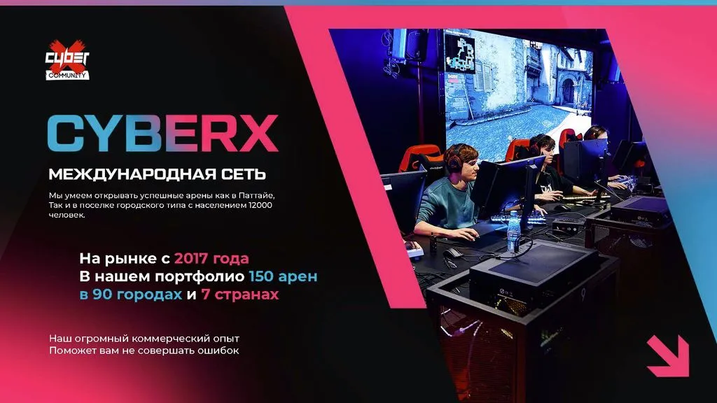 Франшиза Cyber:X Community — это одна из крупнейших международных сетей киберспортивных центров. Всего за 3 месяца вы сможете выйти на операционную рентабельность 💸.