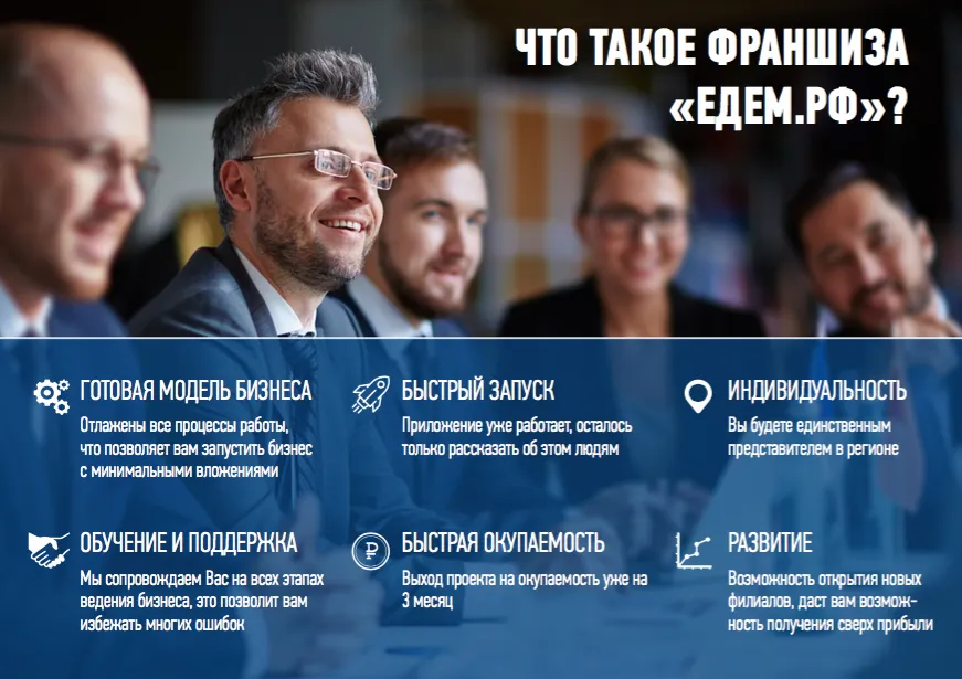 Франшиза Едем.РФ предлагает предпринимателям возможность стать частью успешной транспортной сети 🚏. Партнеры получают доступ к проверенной бизнес-модели, маркетинговой поддержке и IT-инфраструктуре для управления перевозками 🖥пёЏ. Франшиза подходит как для начинающих, так и для опытных предпринимателей, которые хотят развивать свой бизнес в транспортной сфере 🚎. Вложения относительно небольшие, а окупаемость — быстрая, благодаря налаженному потоку клиентов и узнаваемости бренда 🔝.