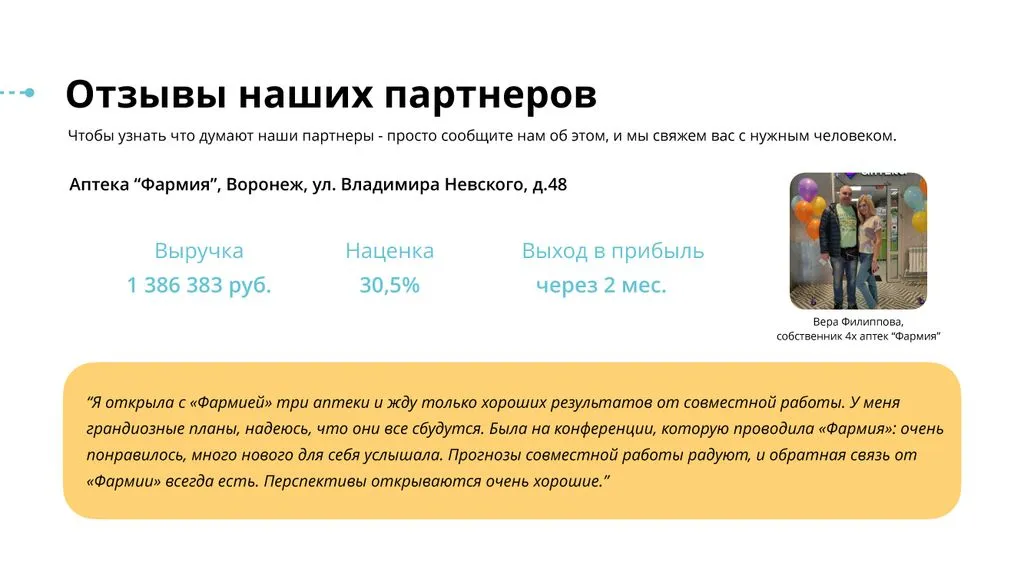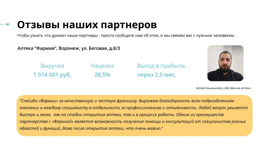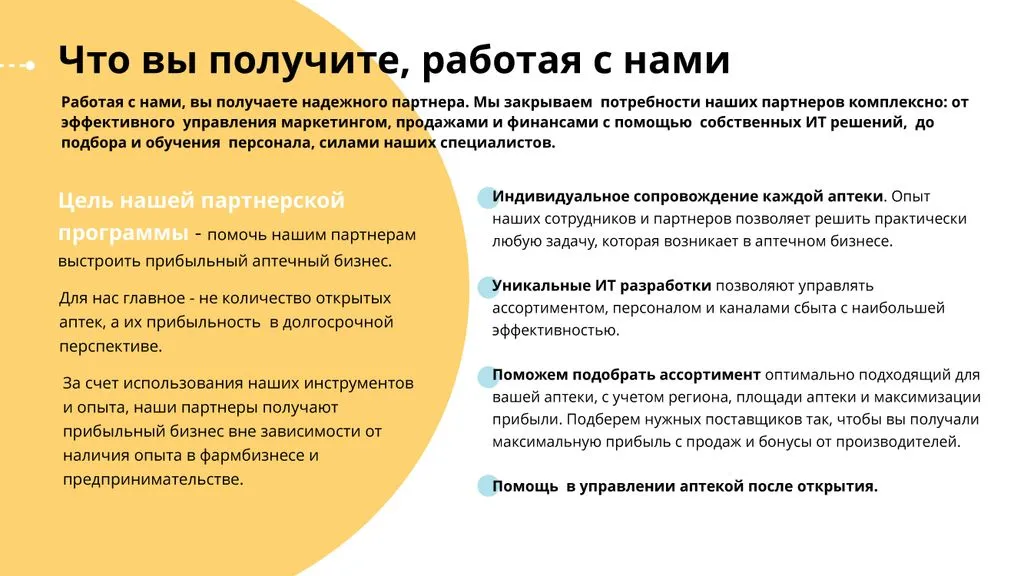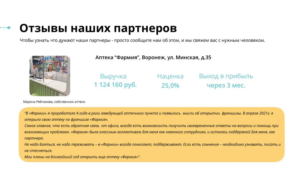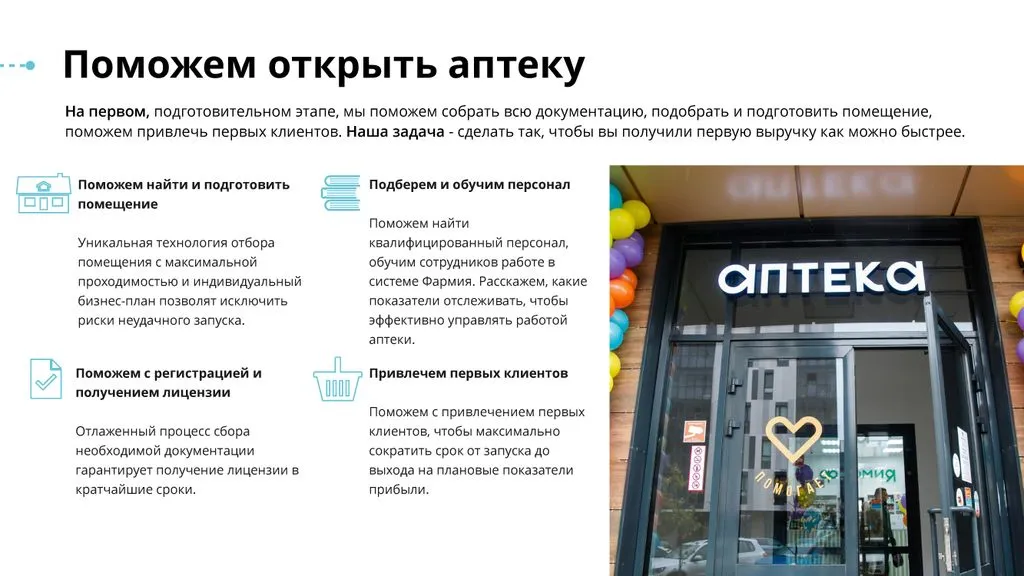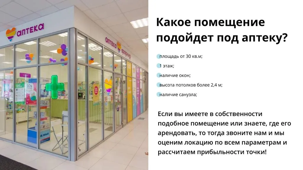 - Прогнозирование прибыли на основе анализа выбранной вами локации. 📊 Бесплатно, до заключения договора, поможем оценить выбранное вами место и спрогнозировать потенциальный доход аптеки.