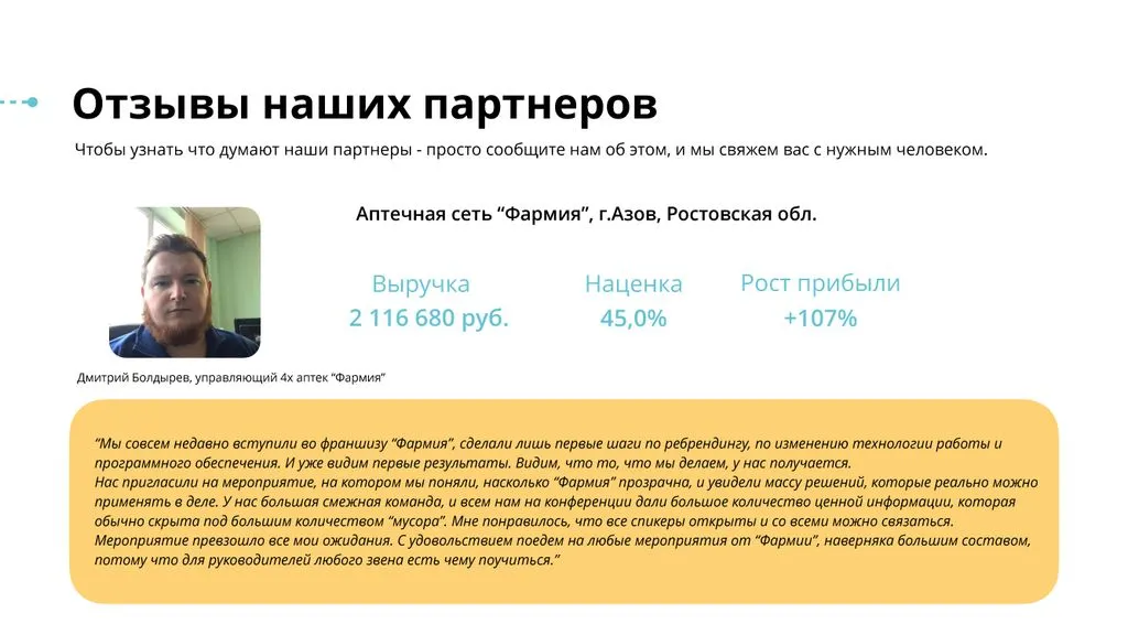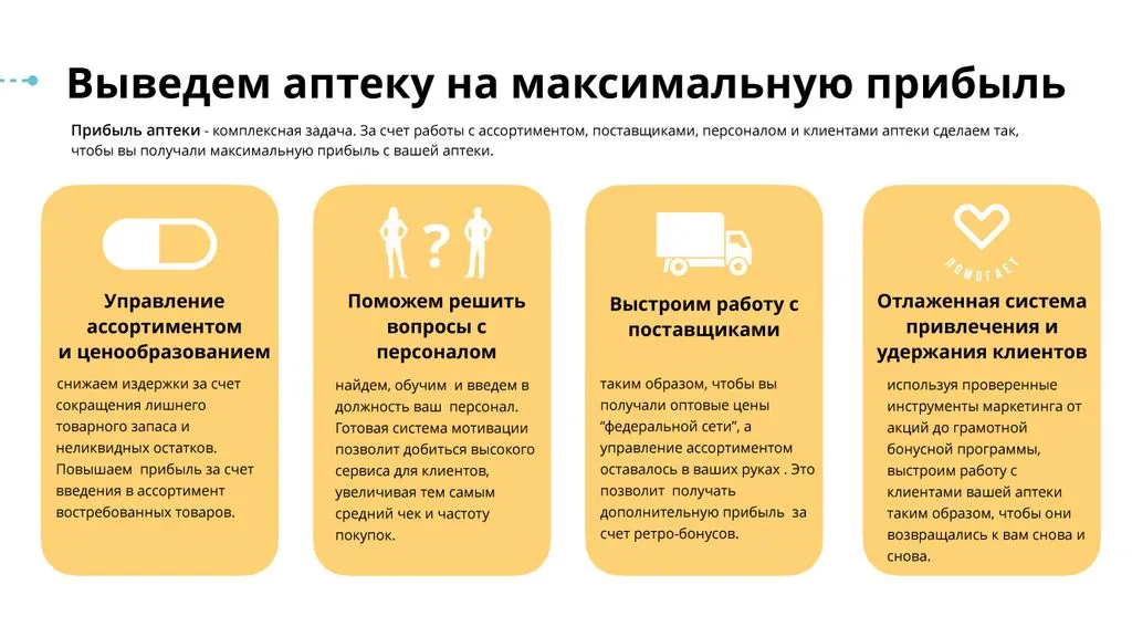 - Индивидуальное сопровождение каждой аптеки. Опыт наших сотрудников и партнеров позволяет решать практически любую задачу, которая возникает в аптечном бизнесе. 📋