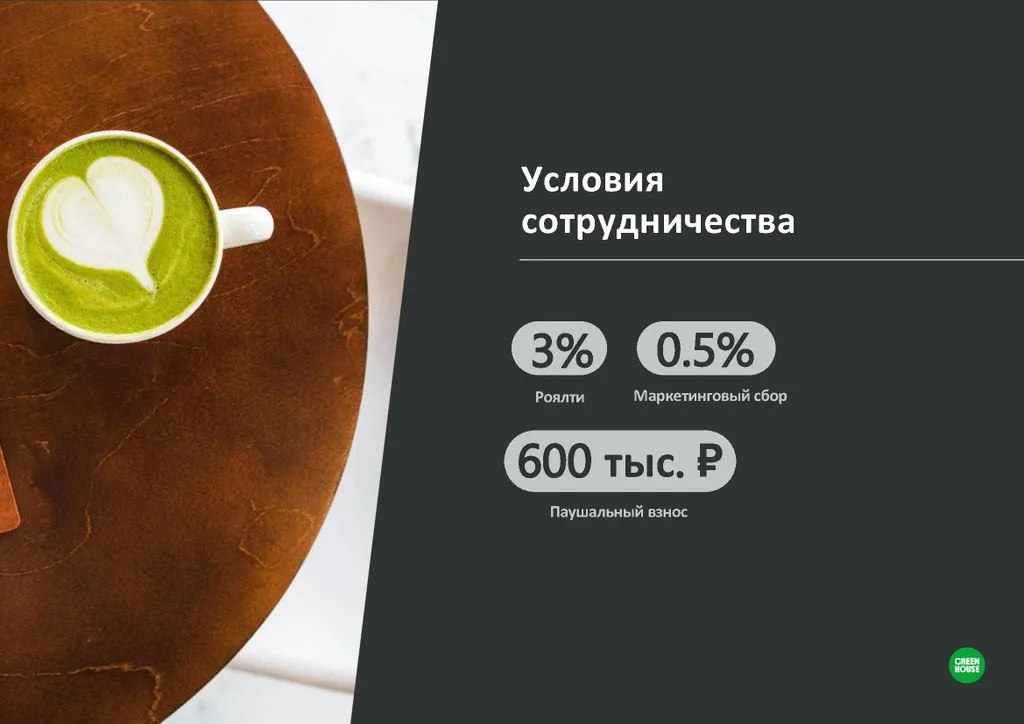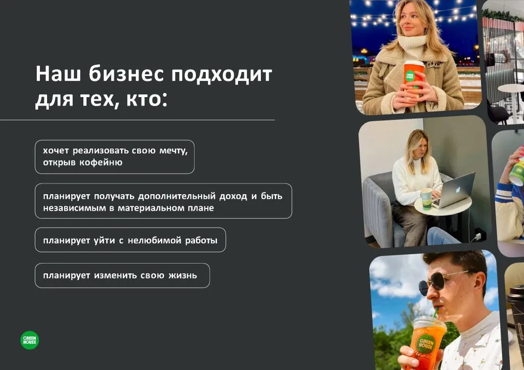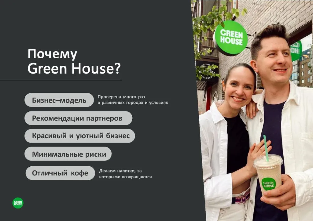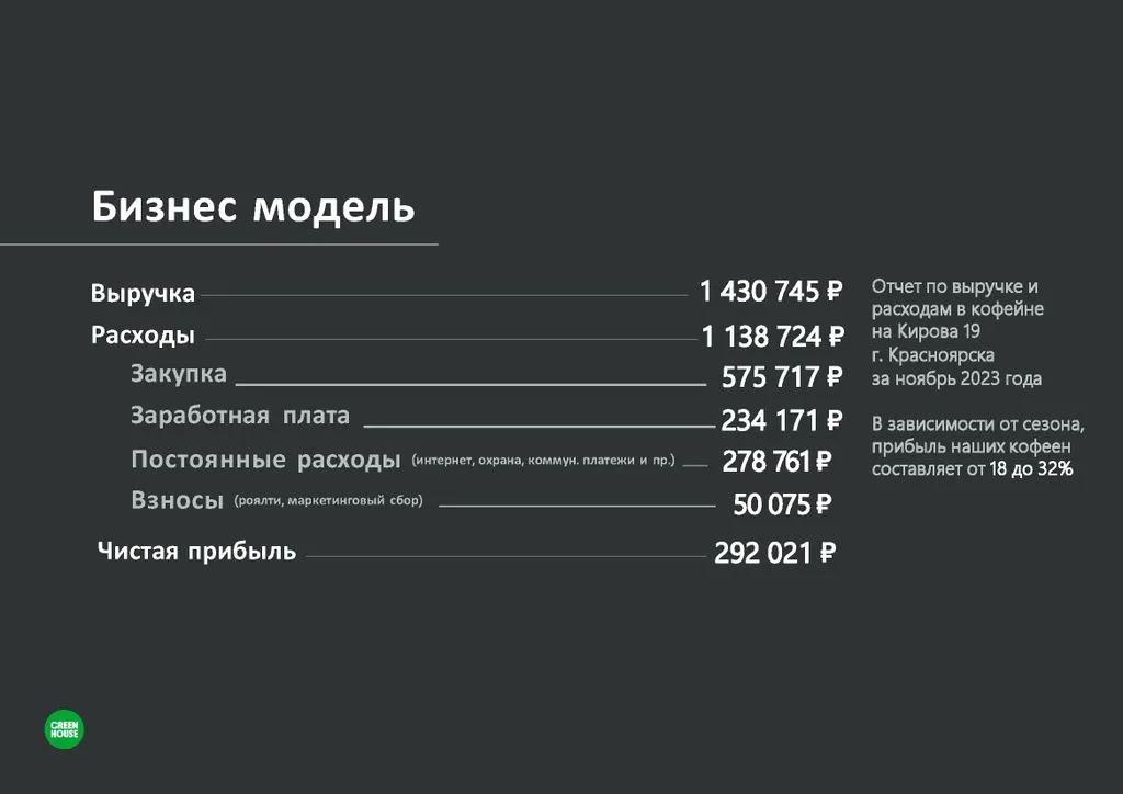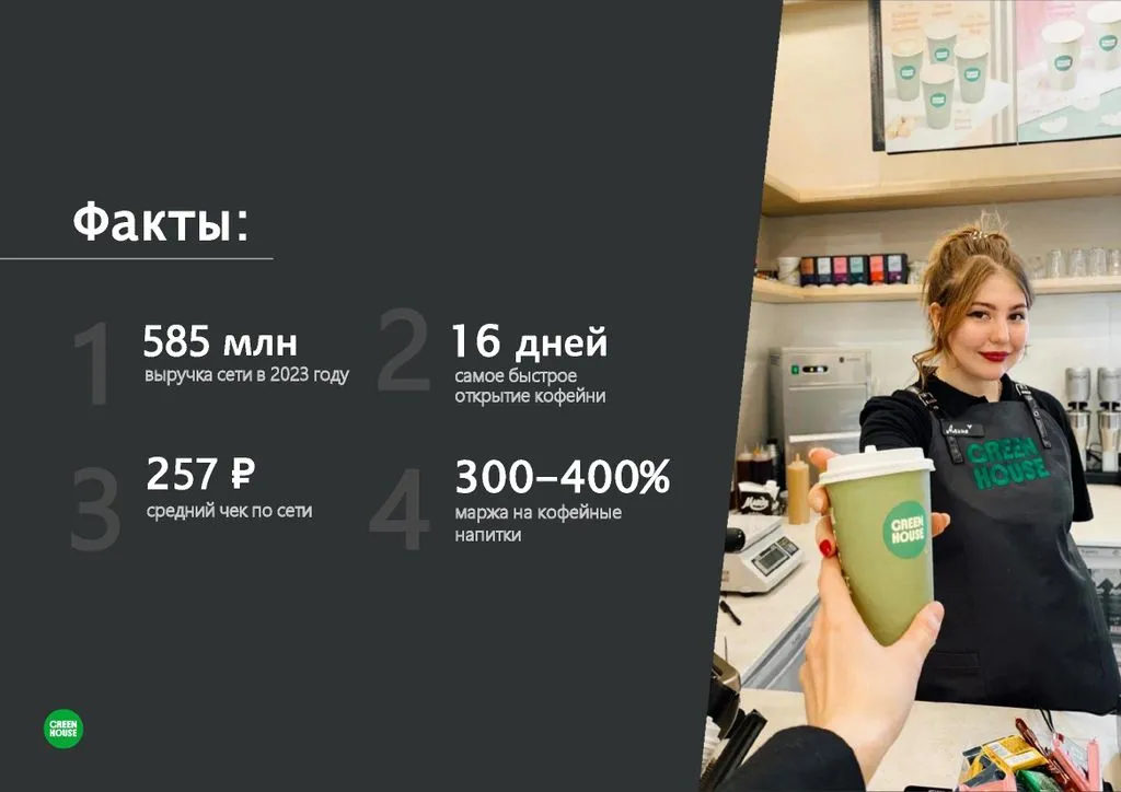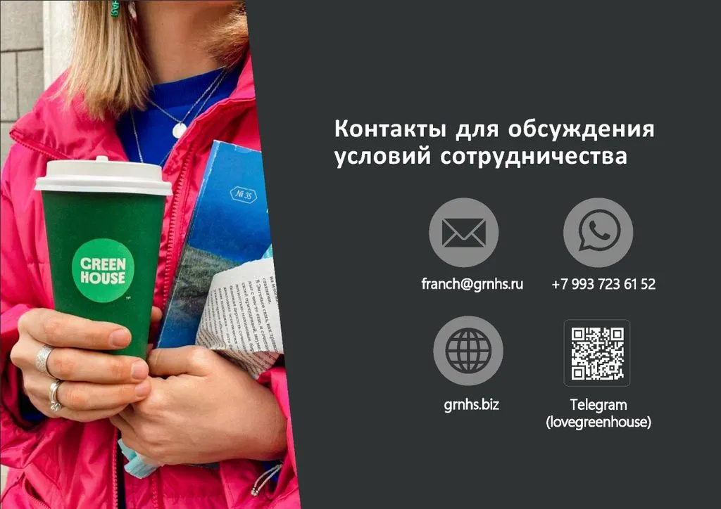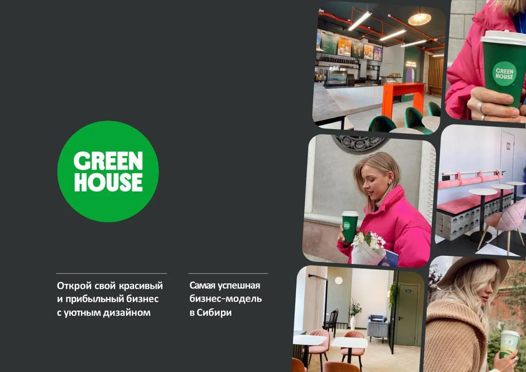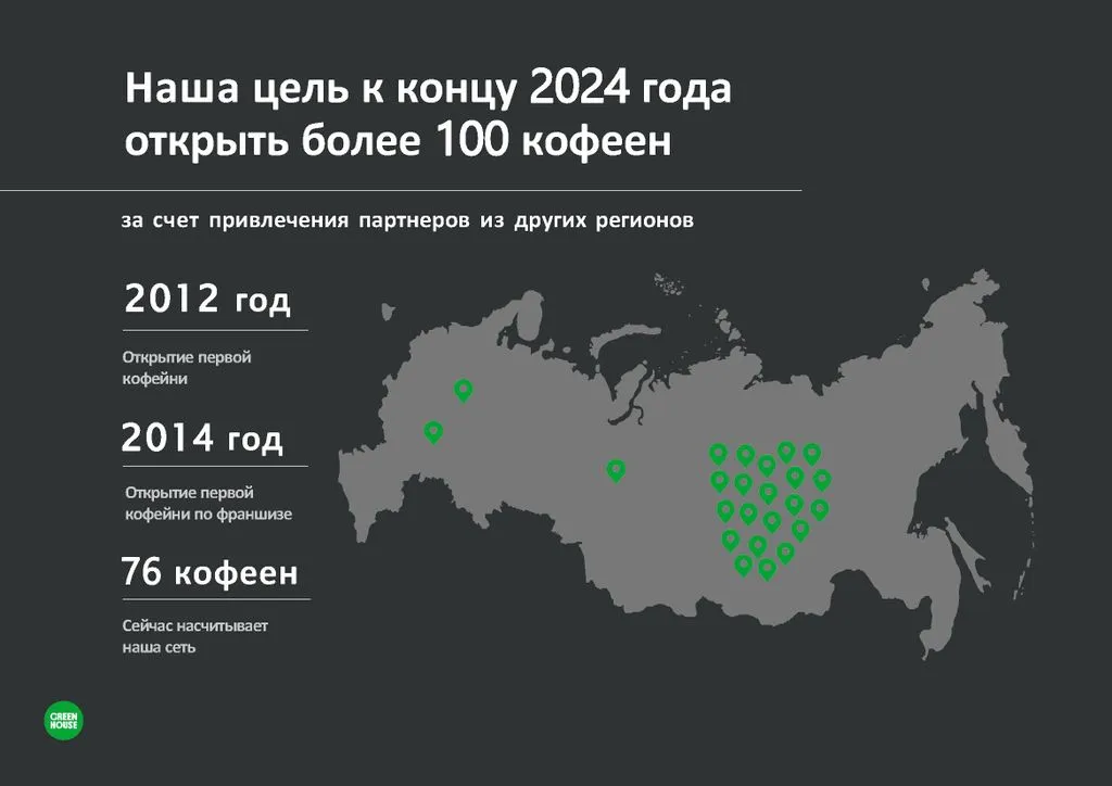 Кофейня «Green House» впервые распахнула свои двери в Красноярске в 2012 году. ☕ Уже к 2014 году мы запустили франчайзинговую сеть, и на сегодняшний день она насчитывает 81 кофейню в 17 городах! 🌍 (Красноярск, Канск, Минусинск, Ачинск, Абакан, Железногорск, Ессентуки, Дивногорск, Волгоград, Черногорск, Сосновоборск, Новосибирск, Иркутск, Якутск, Емельяново, Новокузнецк, Брянск).