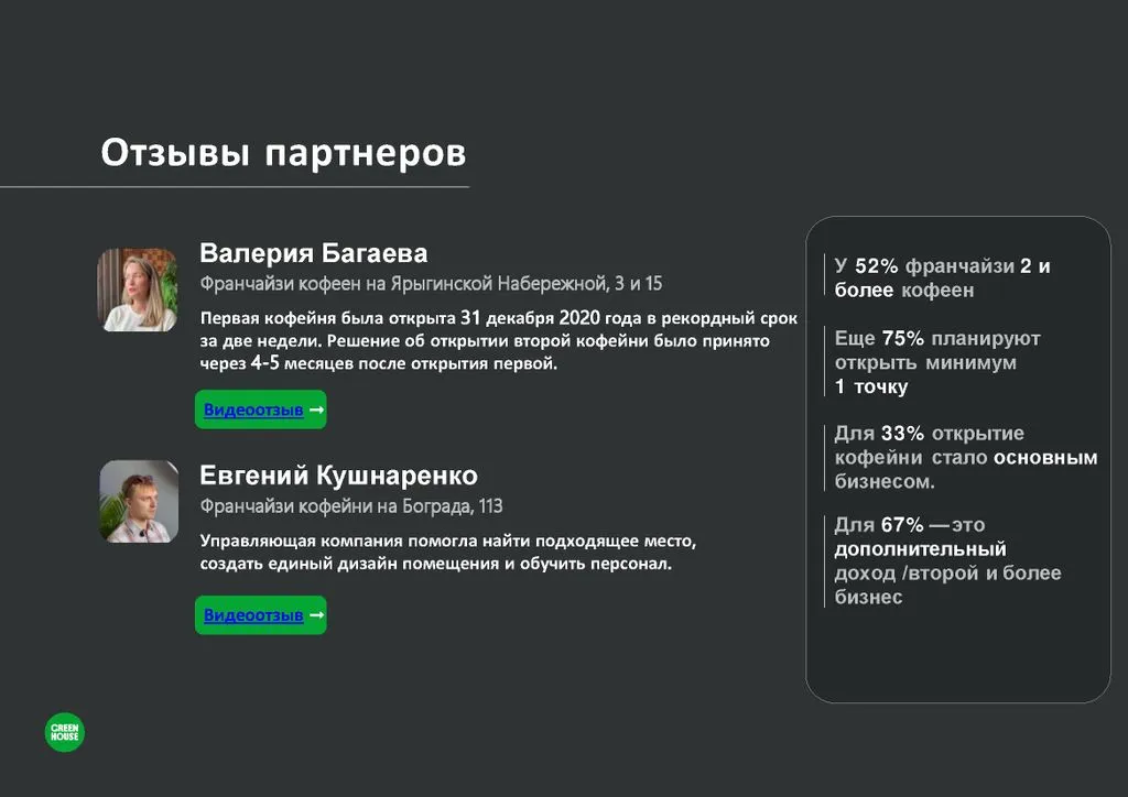 Мы уверены в своей концепции благодаря уникальной организации работы, а наши партнеры — в своем успехе. 🌟 Большинство из них, открыв первую кофейню, через год открывают вторую и третью. 📈