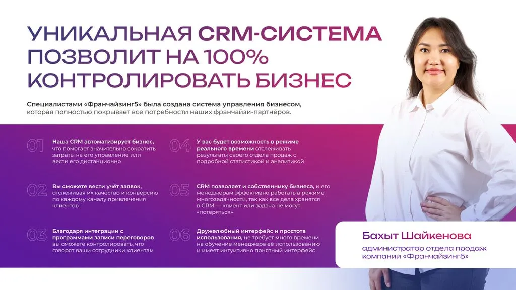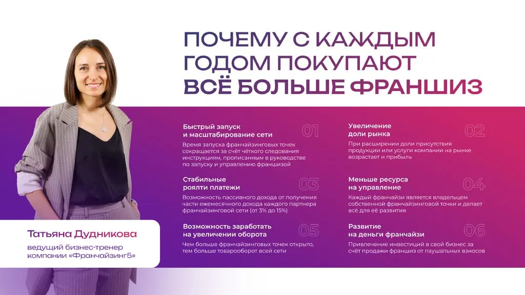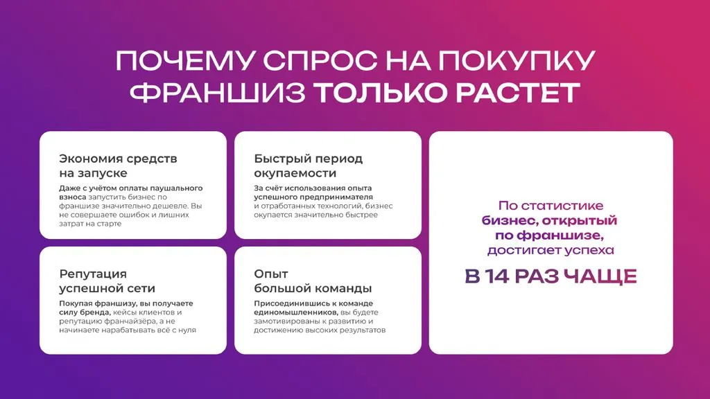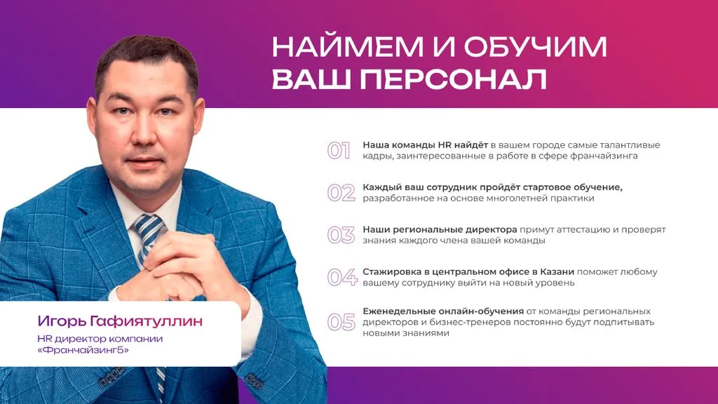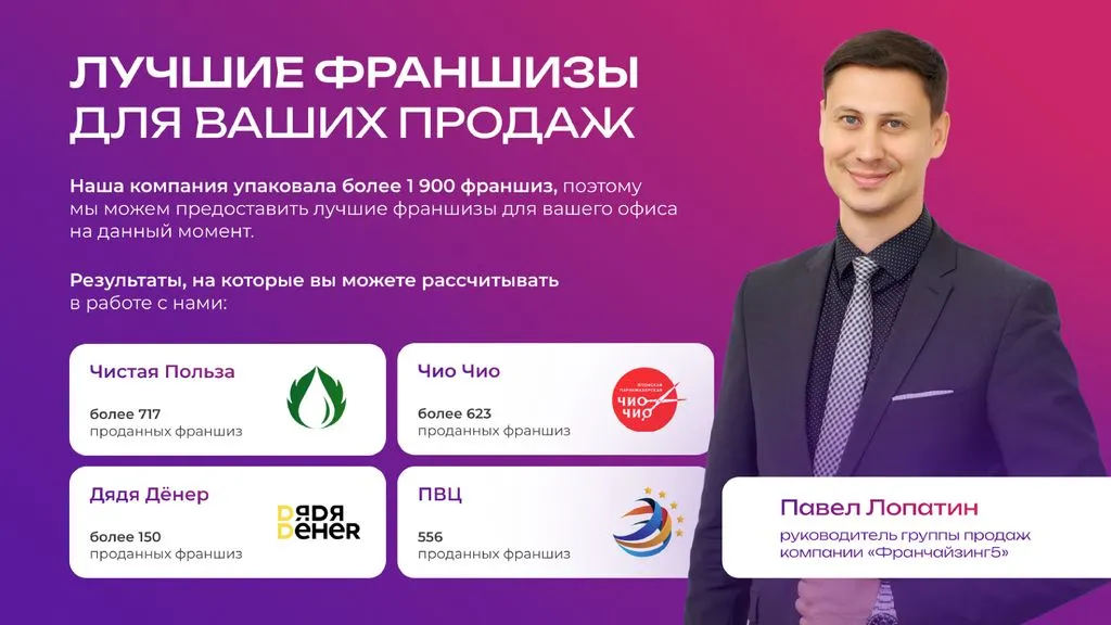 Секрет успеха — это огромный опыт в управлении франчайзинговой сетью. 💼 Передавая опыт и знания клиентам, мы помогаем бизнесменам не только получить качественную франшизу, но и успешно управлять своим новым делом. 💪