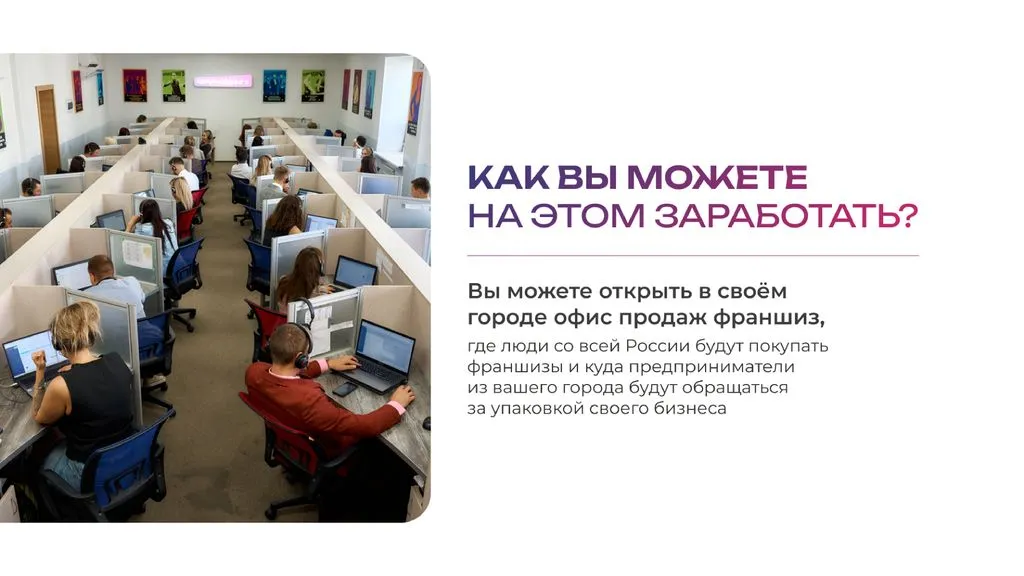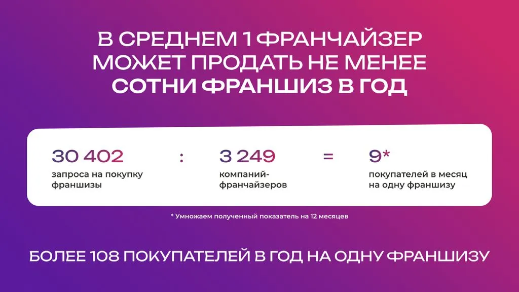 Средний чек за упаковку бизнеса во франшизу — 600 000 рублей, доход франчайзи-партнёра составляет 50% или 300 000 рублей с одной сделки. 💸