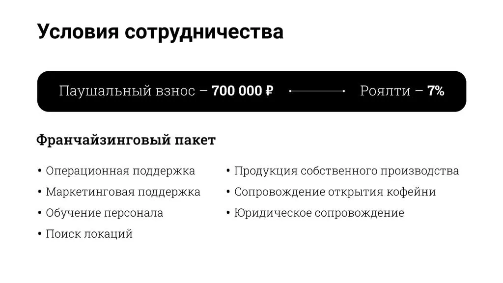 Мы предлагаем различные форматы открытия: от небольшой кофейни до больших заведений с посадочными местами. 🛋️ Заботимся о качестве, ценах и атмосфере, создаваемой нашими дизайнерами. А вся команда поможет вывести ваше заведение на чистую прибыль. 💪