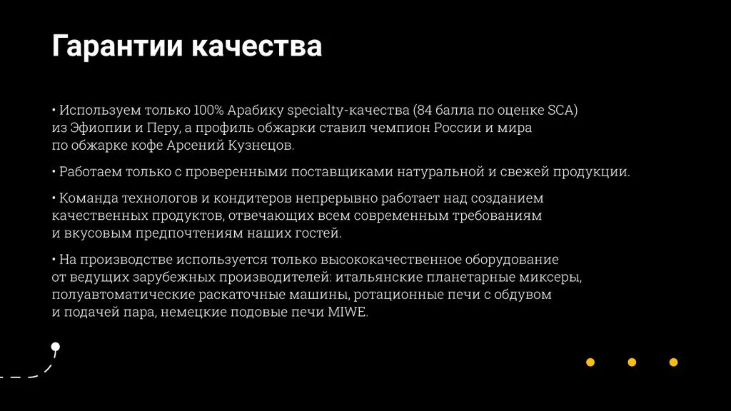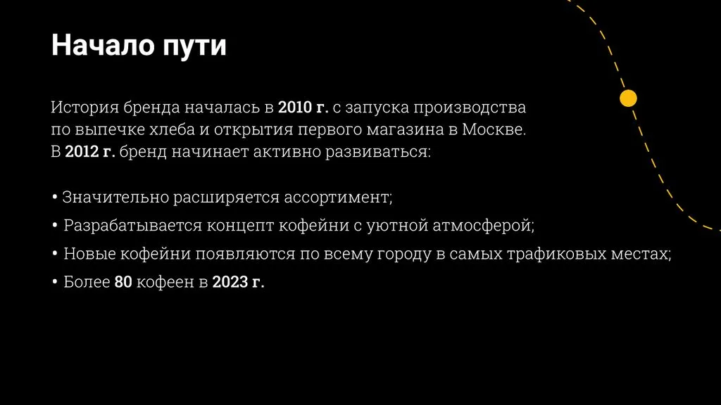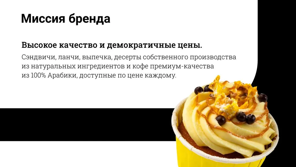 Вскоре мы открыли первую кофейню и расширили меню: добавили сэндвичи, выпечку, десерты и премиальный кофе из 100% арабики. На волне успеха мы увеличили производство и начали открывать новые фирменные точки по всей Москве. 🏙️