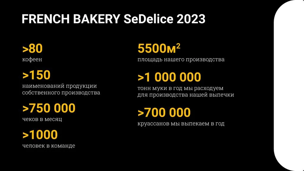 Сегодня French Bakery SeDelice — это более 80 пекарен с собственным производством и ассортиментом из 150 блюд, приготовленных только из натуральных ингредиентов без добавок и консервантов. 🥧 Наша команда насчитывает 450 сотрудников с 12-летним опытом работы. 👥