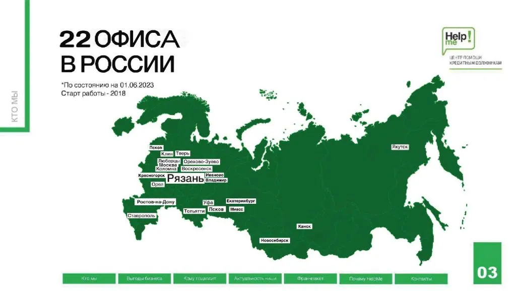Сейчас Help Me – это более 169 сотрудников в 115 офисах по всей стране. Мы помогли более 14 000 клиентам и списали более 6,9 млрд рублей долгов 💰.