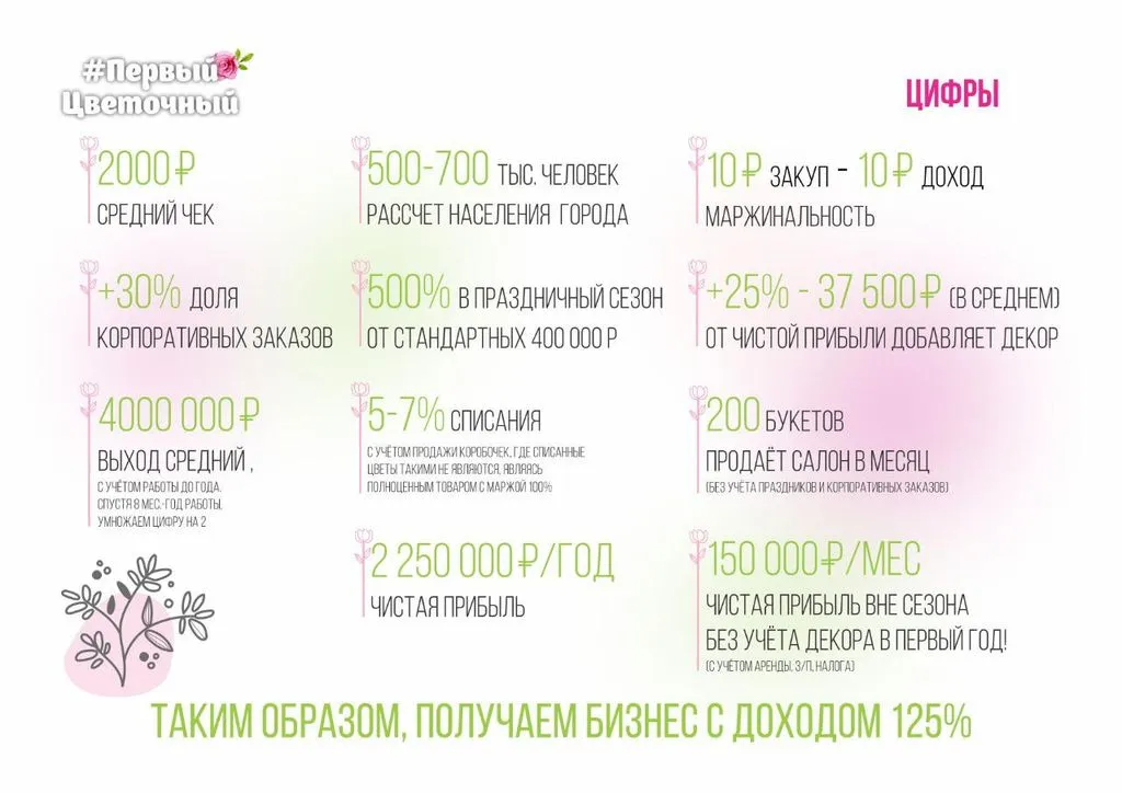 - Бренд и репутация: Сотрудничество с "Первым цветочным" предоставляет доступ к уже зарекомендовавшему себя бренду, который пользуется популярностью среди клиентов.