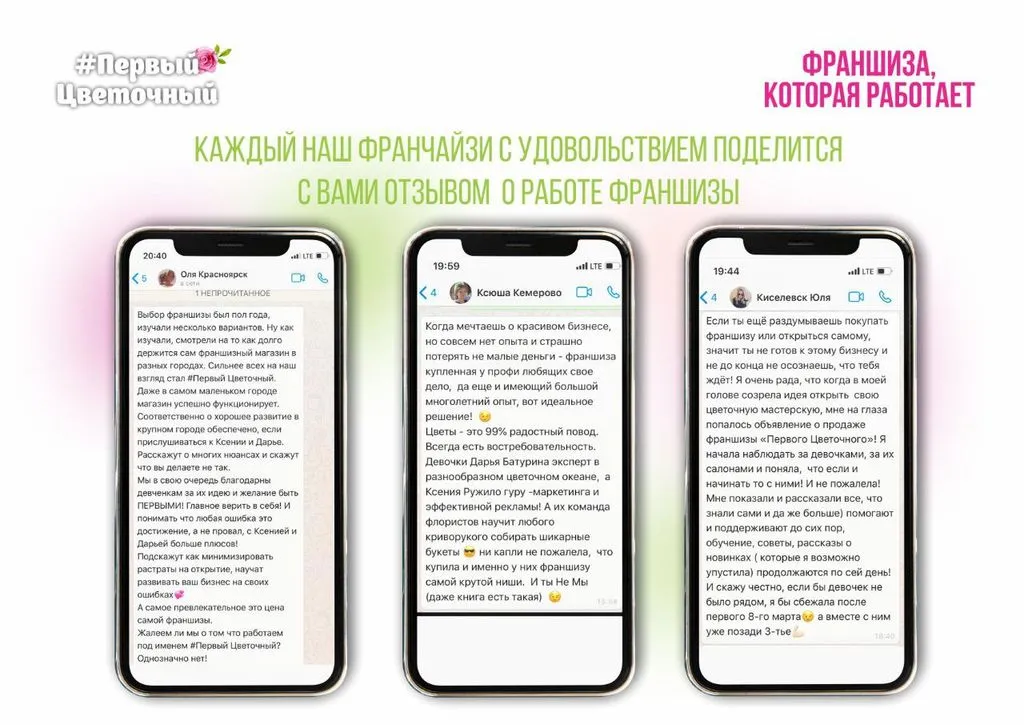 Франшиза "Первый цветочный" предоставляет все необходимые инструменты для успешного ведения бизнеса, помогая избежать многих сложностей, связанных с открытием нового магазина. Это отличная возможность для тех, кто хочет стать частью успешной сети и работать в индустрии, где всегда есть спрос.