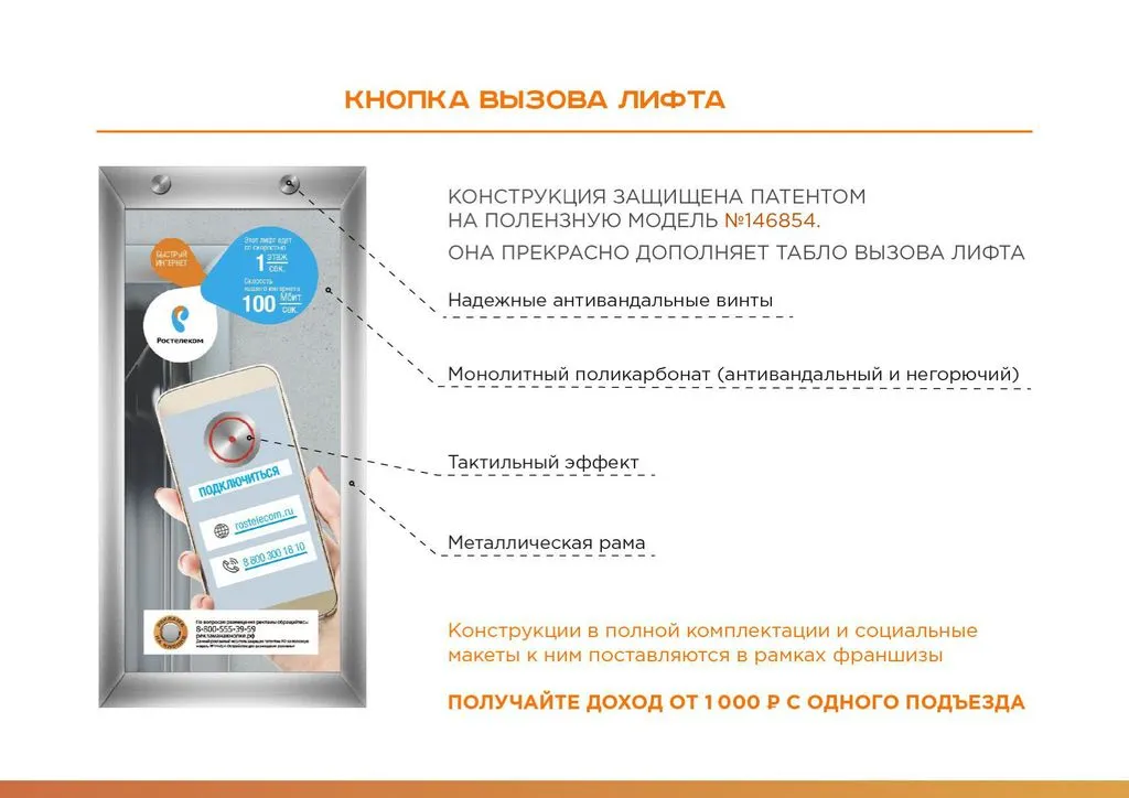 - Оборудование: Франчайзи получают от 300 до 1 300 рекламных конструкций и соответствующее количество макетов для размещения социальной рекламы на кнопках и табло лифта.