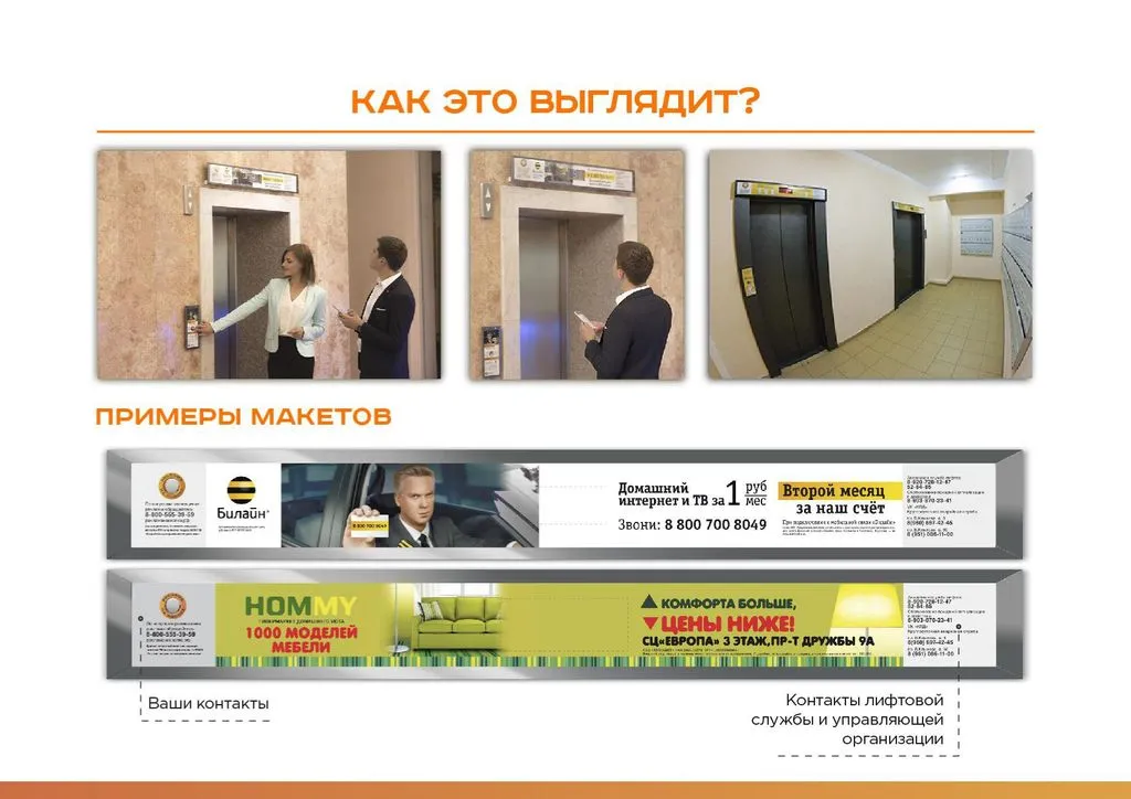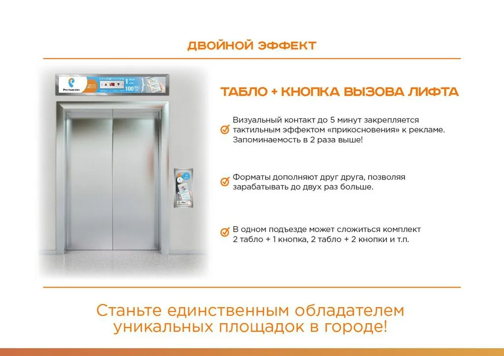 - Прямое взаимодействие с целевой аудиторией — каждый пользователь лифта контактирует с рекламой.