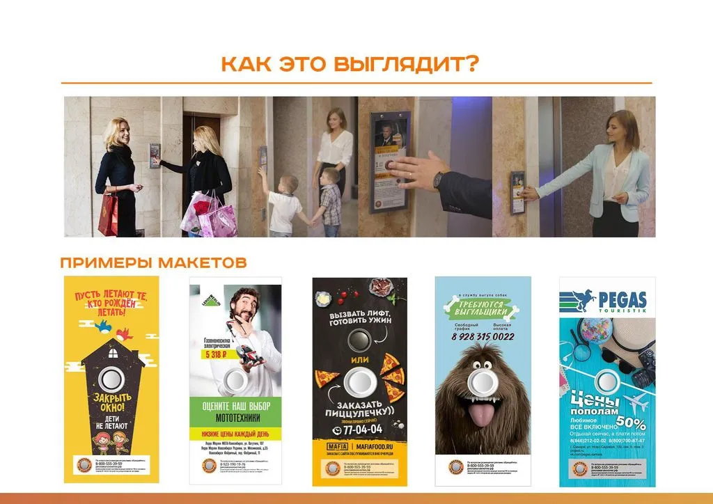 «Реклама на кнопке и табло лифта» — это современная концепция визуальной и тактильной рекламы, с которой ежедневно контактирует огромное количество людей. Проект предлагает размещение рекламных сообщений на кнопках вызова лифта и на табло над дверями. Франшиза активно развивается в России и уже зарекомендовала себя как прибыльный и востребованный бизнес.