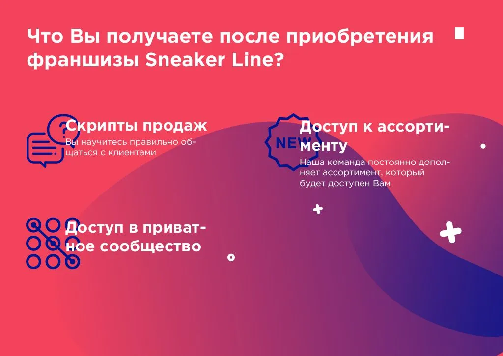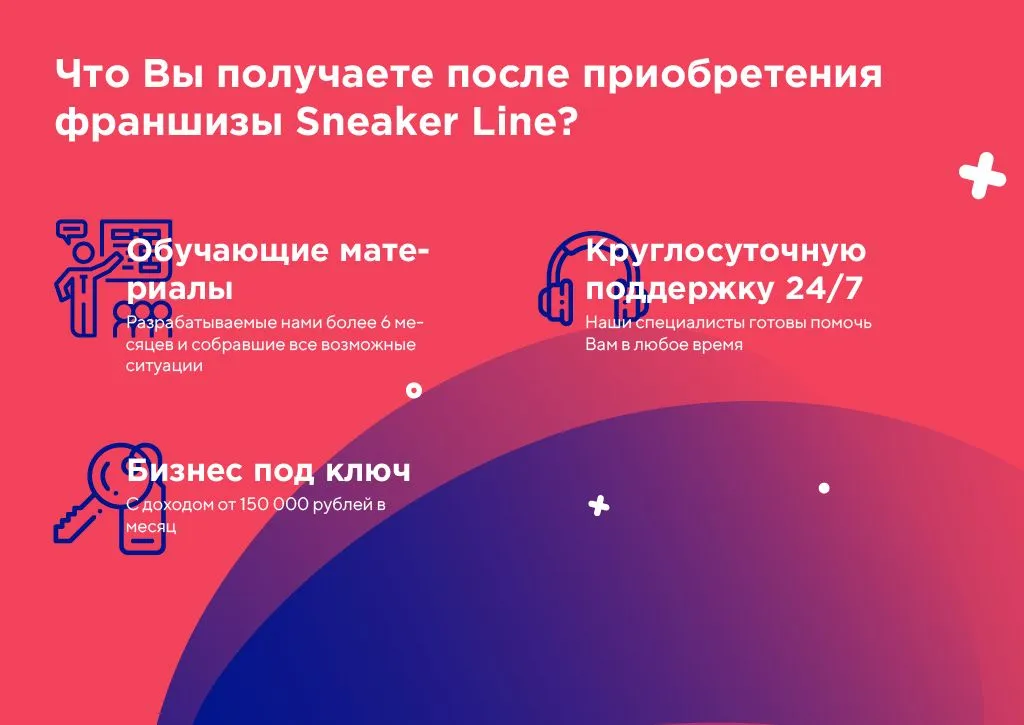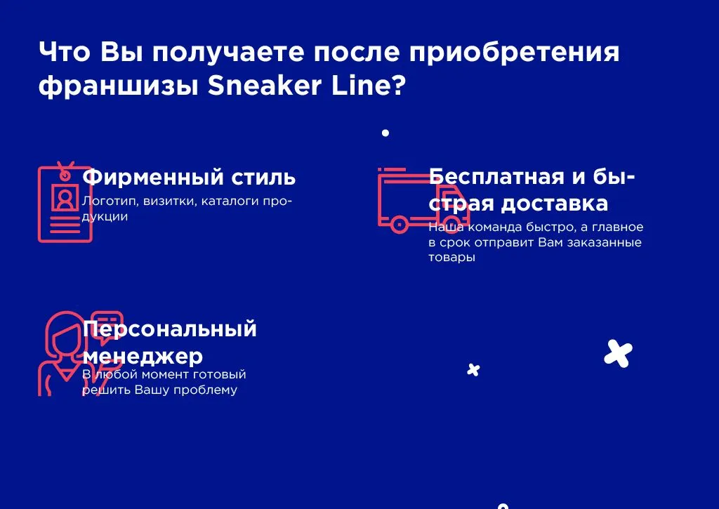 Франшиза Sneaker Line предоставляет возможность открыть собственный магазин под известным брендом с минимальными рисками. Вот ключевые условия, которые предлагает франчайзер: