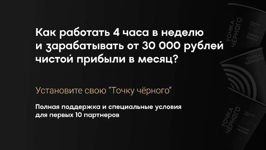 Теперь мы знаем: всего одна или две кофейни под брендом «Точка Чёрного» могут избавить вас от необходимости работать на кого-то, позволяя проводить больше времени с семьёй или занимаясь любимыми увлечениями, при этом обеспечивая хороший доход. 💰👨👩👦