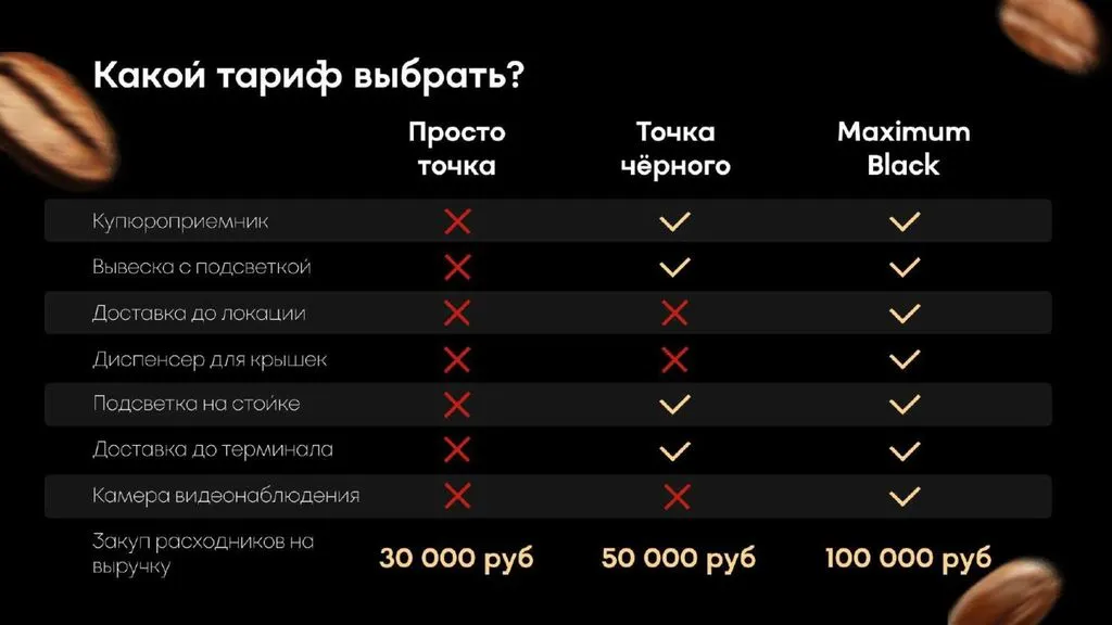- Возможность финансирования вашего кофейного бизнеса через кредит или рассрочку с выгодными условиями в более чем 200 банках-партнёрах. 🏦
