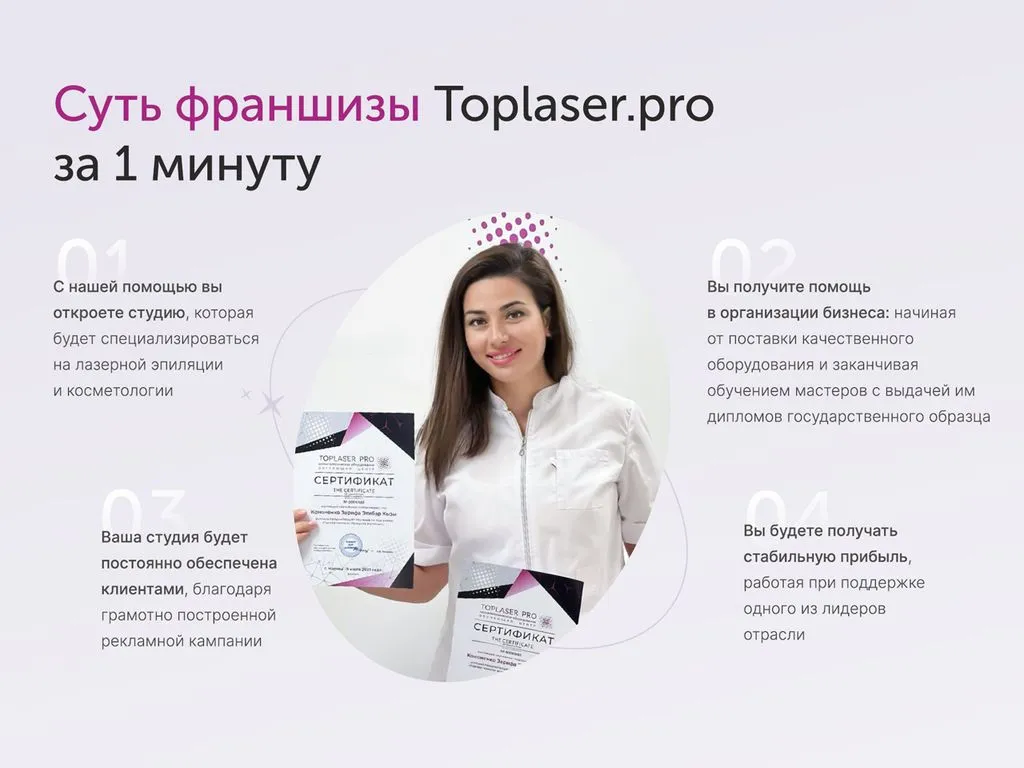 Сегодня Top Laser Pro — это одна из лучших франшиз студий лазерной эпиляции и команда экспертов с многолетним опытом в области косметологии, продаж оборудования и развития бизнеса по франшизе. Присоединяйтесь к нам — мы научим вас всему 💼!