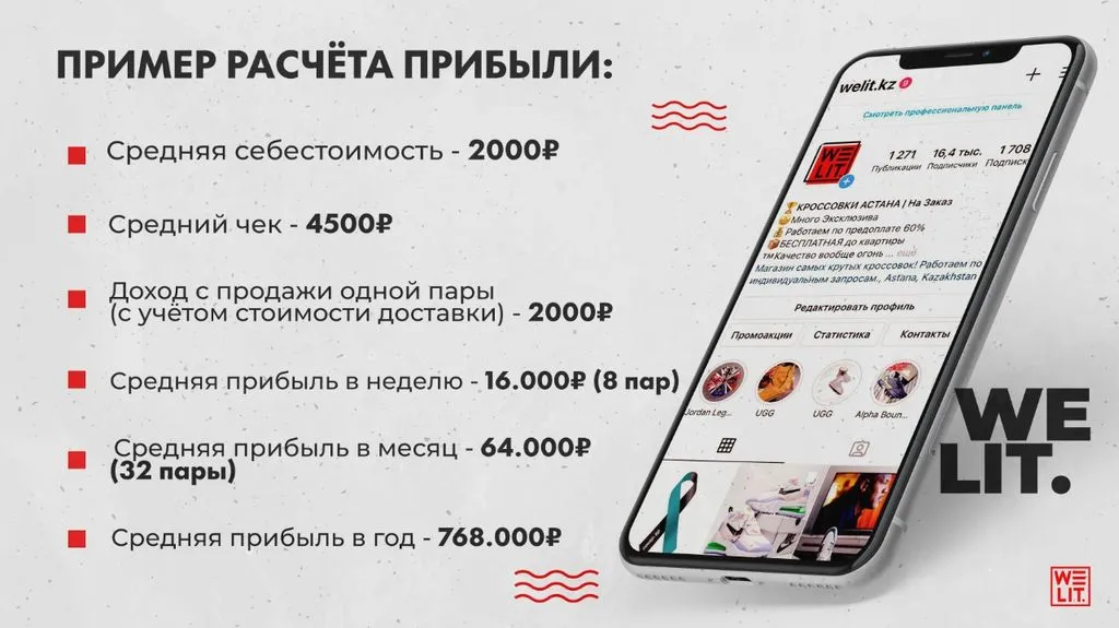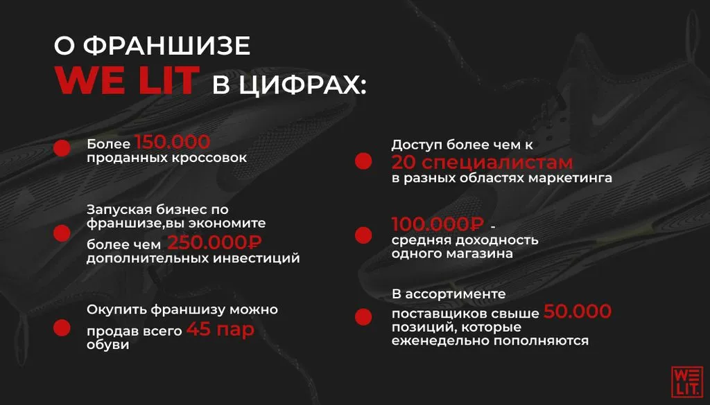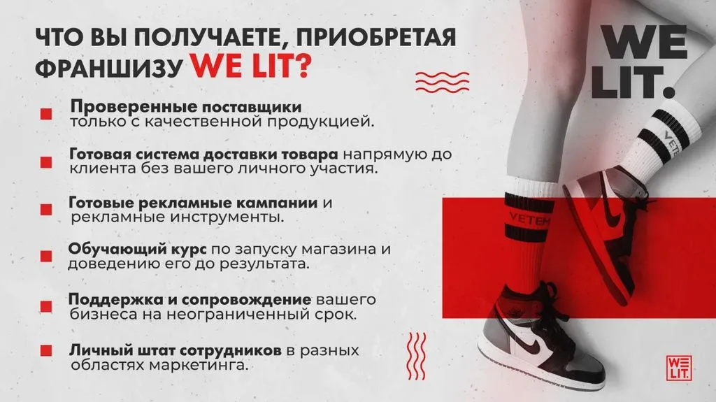 WE LIT — это франшиза интернет-магазина, специализирующегося на продаже оригинальных кроссовок мировых брендов, таких как Nike, Adidas, New Balance, Reebok и других. Компания была основана в 2015 году в Казахстане и быстро вышла на международный рынок, распространив свои услуги по России, Казахстану, а также в странах СНГ. Франшиза действует с 2016 года и предлагает бизнес-модель с минимальными рисками и быстрым стартом.