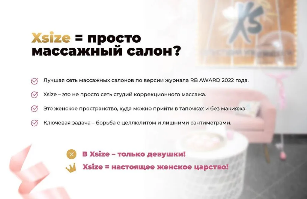 Xsize — это студия коррекционного массажа в уникальном формате! 💁♀️ Мы создали пространство только для женщин, где можно расслабиться в тапочках и без макияжа. Вход только для девушек!
