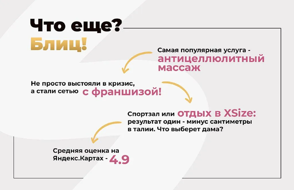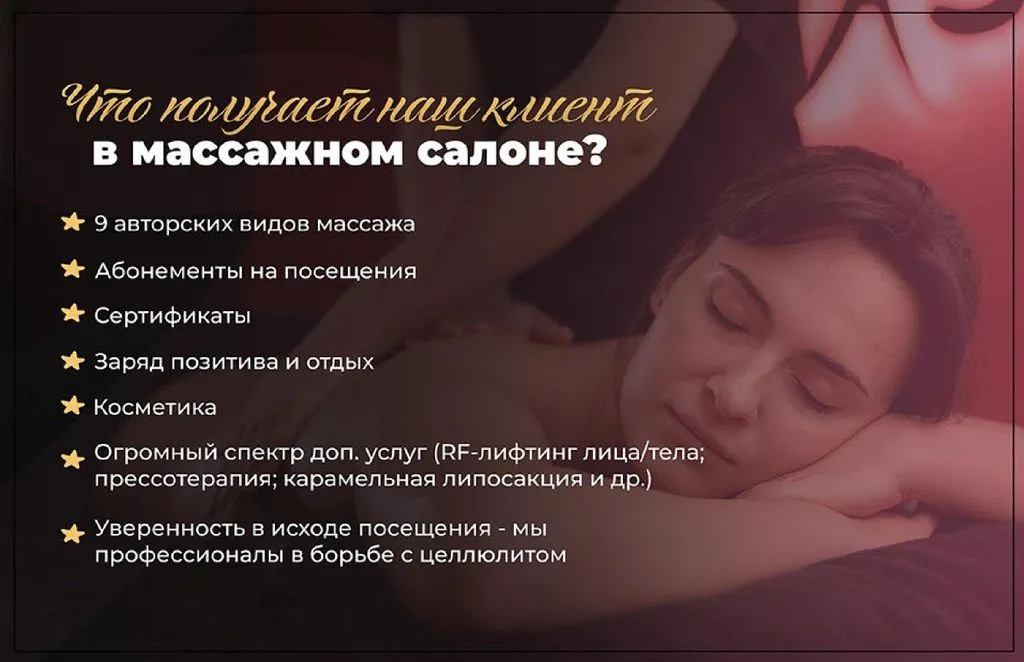 - ⭐ Клиенты. У нас тысячи клиентов, 70% из которых приходят по «сарафанному радио». Мы решаем проблему целлюлита комплексно, и это то, что нужно нашим клиентам.