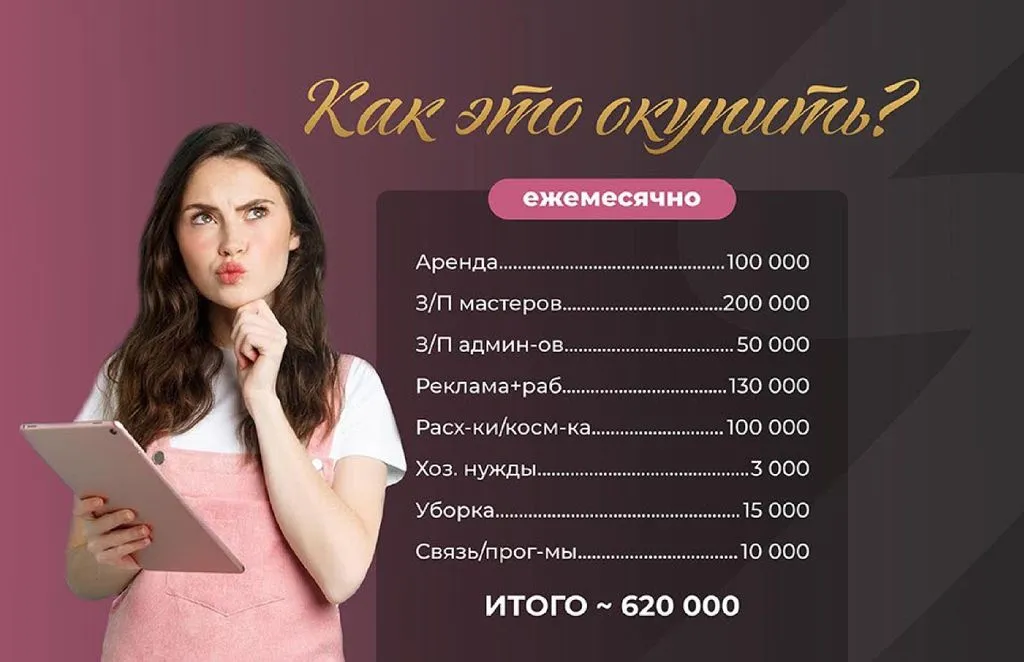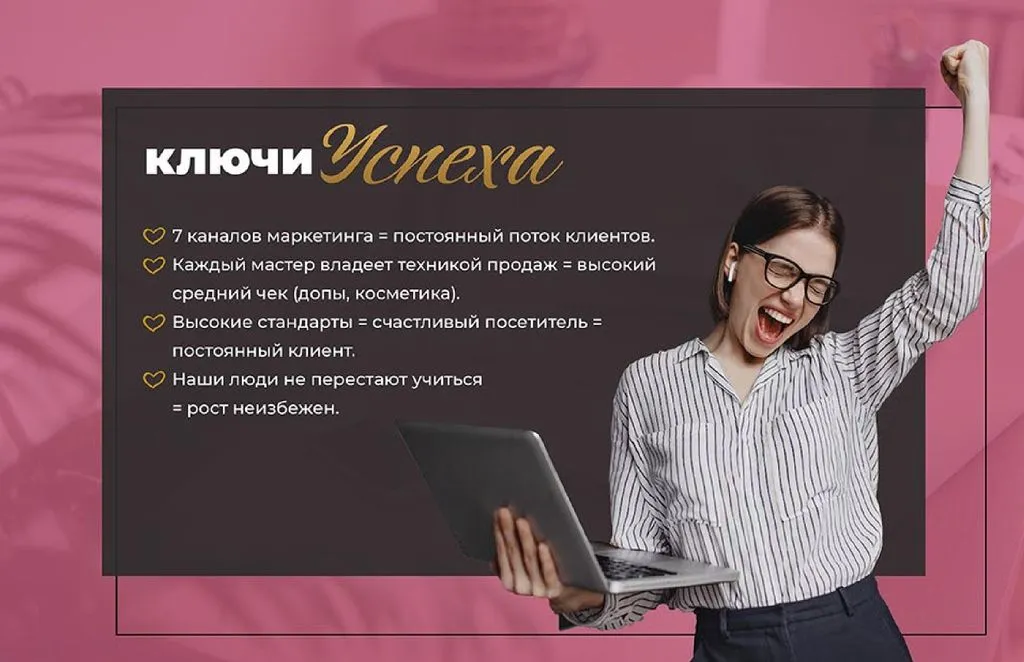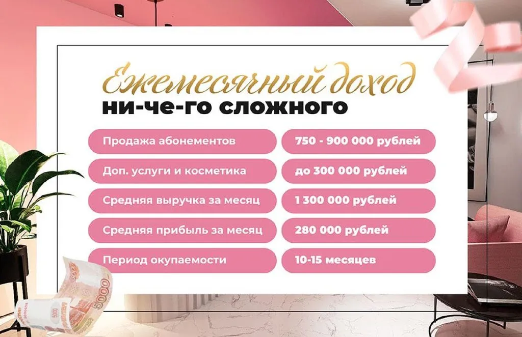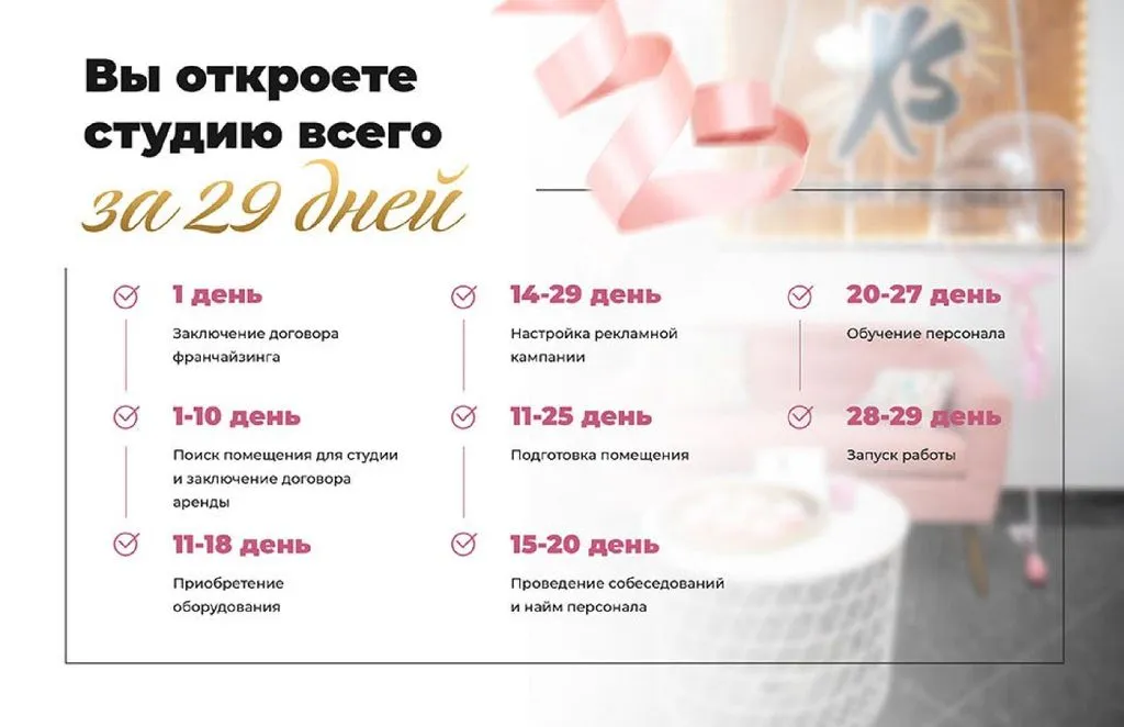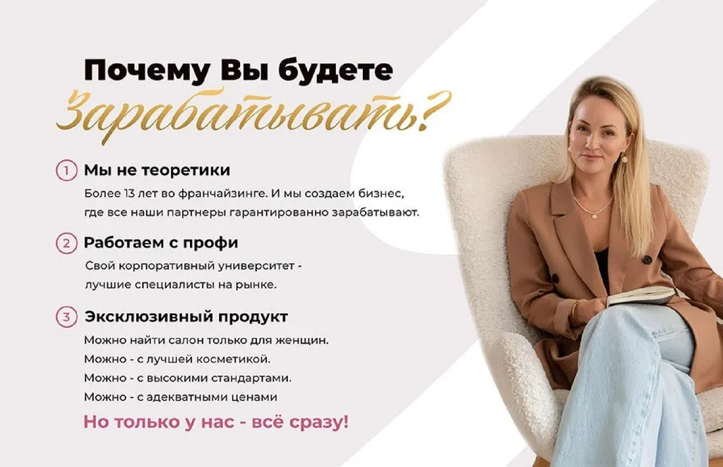 - ⭐ Не нужен опыт. Франшиза подходит для предпринимательниц с любым опытом. Мы берём на себя маркетинг, звонки и обучение сотрудников, минимизируя риски и сокращая сроки окупаемости.